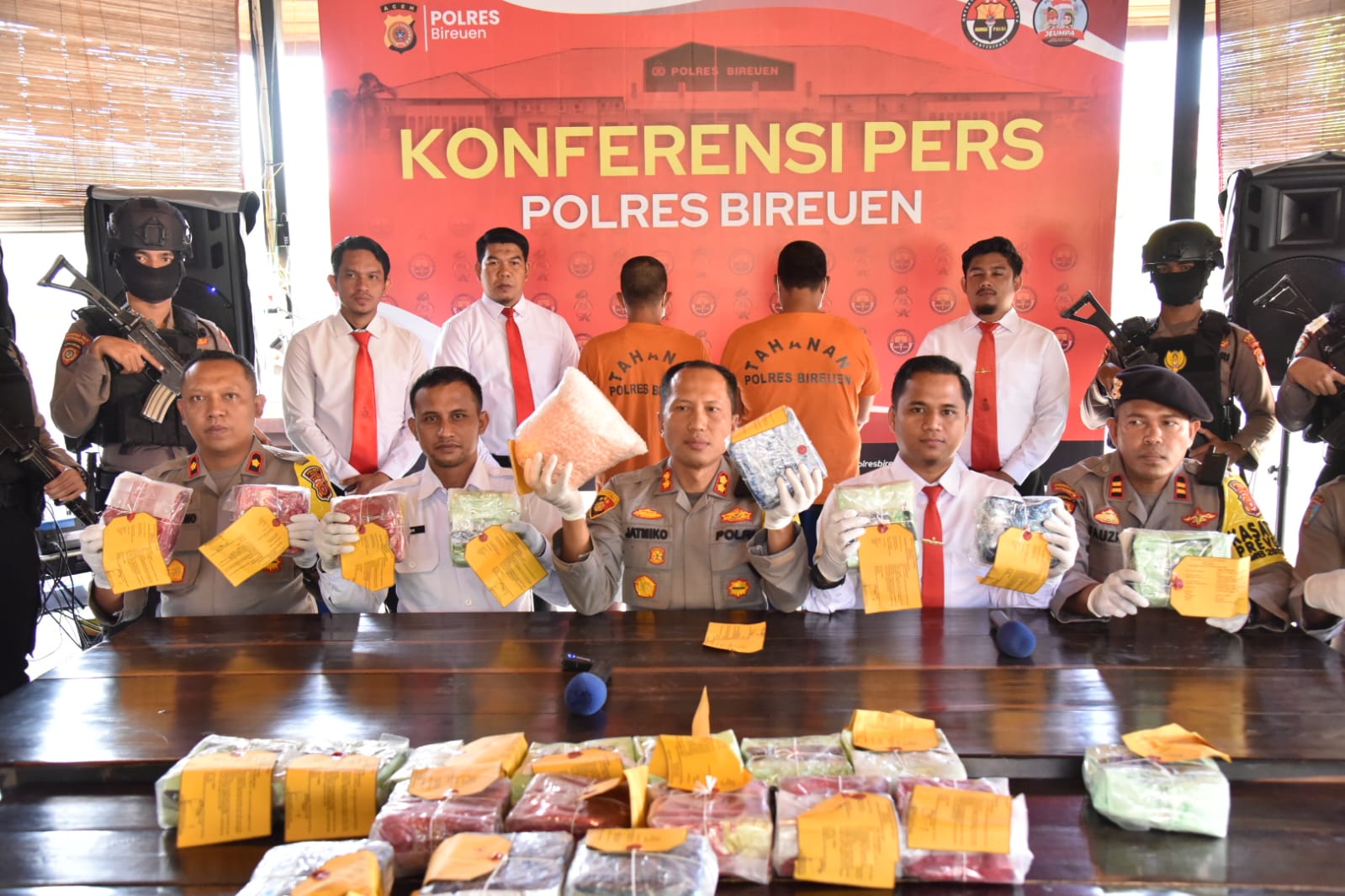 JURNAL POLRI.COM-BIREUEN-ACEH-Polres Bireuen merilis Pengungkapan Jaringan Narkotika dengan Barang Bukti 28 Kg Sabu dan 5000 Ekstasi serta 2 Tersangka, M (40) dan